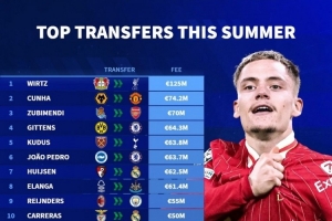 今夏球员转会费排名:维尔茨1.25亿欧居首,库尼亚、祖比门迪前三