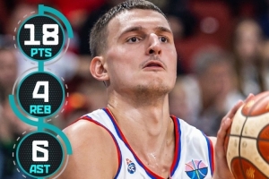 此役,塞尔维亚新星约维奇出战三节,登场15分51秒,投篮8中6,三分4中3,罚球3中3,得到18分4板6助1断,正负值+36。