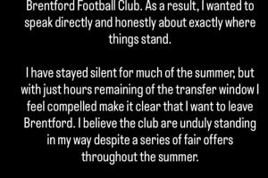 这个夏天我大多保持沉默,但在转会窗仅剩数小时之际,我不得不明确表示:我希望离开布伦特福德。尽管整个夏天收到了多份合理报价,我认为俱乐部正在过度阻挠我的转会。