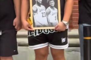 有网友晒出视频,视频中有球迷拿着詹姆斯和布朗尼的黑白合照在外滩驻足等待。