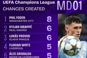 欧冠首轮创造机会榜:福登8次领跑,姆巴佩6次、维尔茨5次