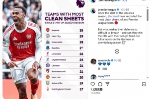 体育资讯10月10日讯 根据英超官方的数据统计,自2023-24赛季开始至今,阿森纳零封场次在所有英超球队中排名第一,他们有35场比赛没有丢球。