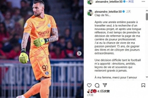 体育资讯10月15日讯 34岁前巴黎圣日耳曼门将莱特利尔在社媒宣布,结束15年的职业生涯。