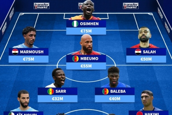 体育资讯10月16日讯 德转盘点了非洲足联球员的最高身价阵容,整套阵容总价值高达5.42亿欧元。其中巴黎后卫阿什拉夫以8000万欧元成为身价最高的球员,奥斯梅恩、马尔穆什以7500万欧元紧随其后。