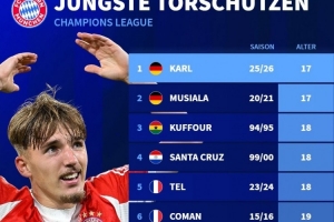 体育资讯10月23日讯 欧冠联赛阶段第三轮比赛,伦纳特-卡尔破门,拜仁主场4-0击败布鲁日。据德国转会市场统计,伦纳特-卡尔是拜仁队史最年轻欧冠进球者,也是欧冠进球最年轻的德国球员。