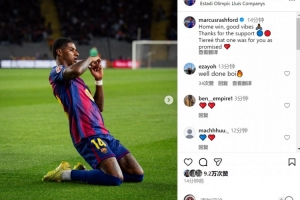 拉什福德社媒晒照庆祝胜利,配文:“主场胜利,气氛绝佳。感谢大家的支持,蒂埃雷,正如我所承诺,这粒进球献给你。”