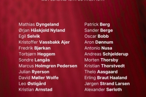 中前场:阿恩斯塔德(奥胡斯)、帕特里克-伯格(博德闪耀)、桑德-博格(富勒姆)、鲍勃(曼城)、冬纳姆(图卢兹)、努萨(莱比锡)、谢尔德鲁普(本菲卡)、托斯比(热那亚)、托尔斯特韦特(萨索洛)、阿斯高(流浪者)、哈兰德(曼城)、拉尔森(狼队)、瑟尔洛特(马竞)