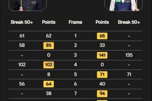 全场比赛,江俊打出一杆135分和两杆50+(71、58),贺国强打出三杆破百(102、109、118)和三杆50+(61、58、56)