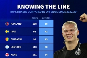 体育资讯11月12日讯 德国转会市场统计了2022-2023赛季以来顶级前锋(中锋)在联赛中的越位次数,哈兰德18次最少,C罗143次最多。