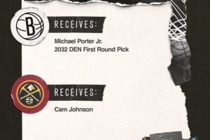 这笔交易中,篮网送出卡梅隆-约翰逊,得到小迈克尔-波特和2032年掘金的首轮选秀权。